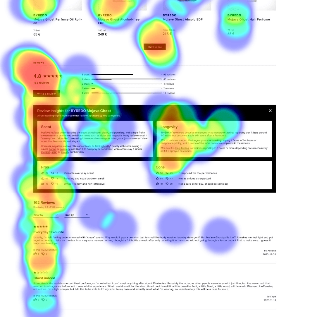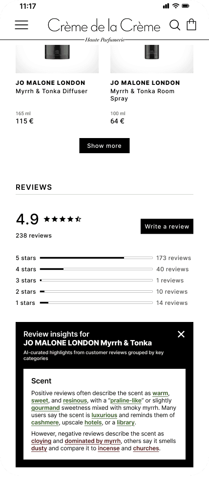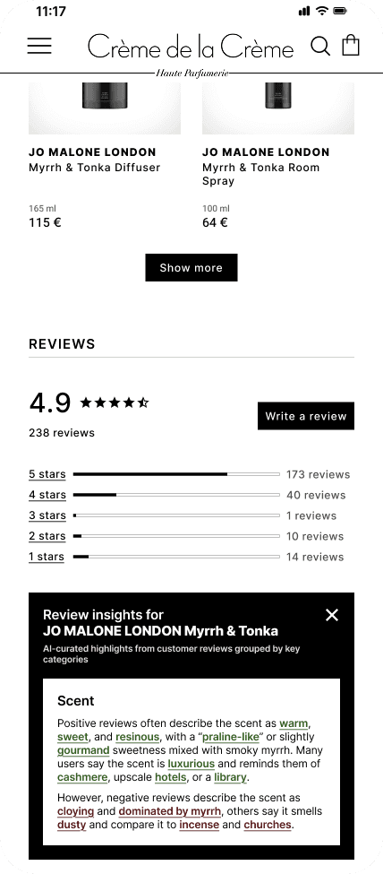 All of the participants were already familiar with Creme de la Creme and some of them were the brand’s customers. Overall, providing users with AI summary snapshots proved very successful - all of the participants not only found that my proposed features were really helpful for deciding whether to buy a fragrance, but some also said that they would actually purchase their first perfume from Creme de la Creme despite the high price point (which had deterred them beforehand).