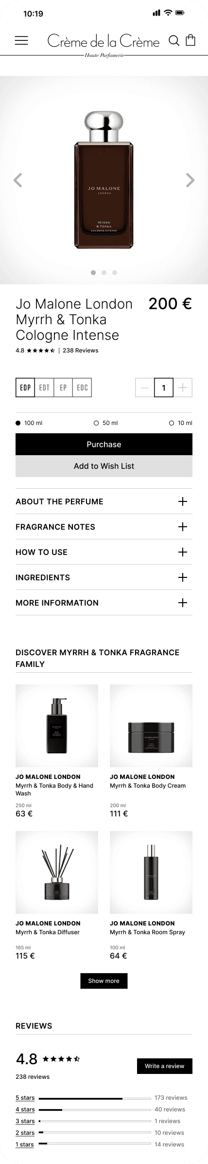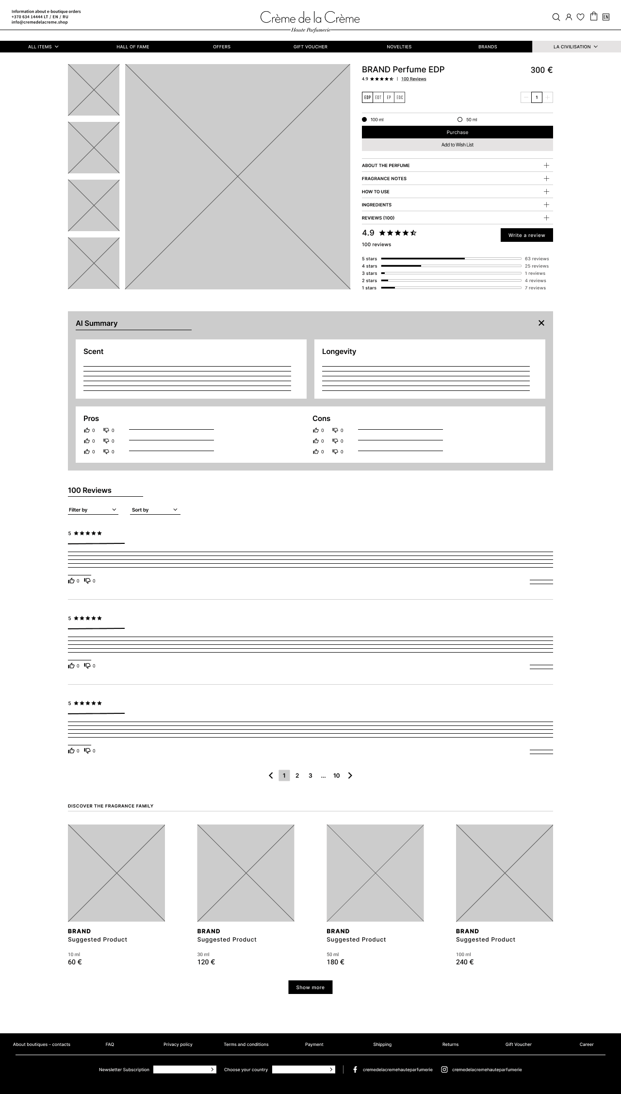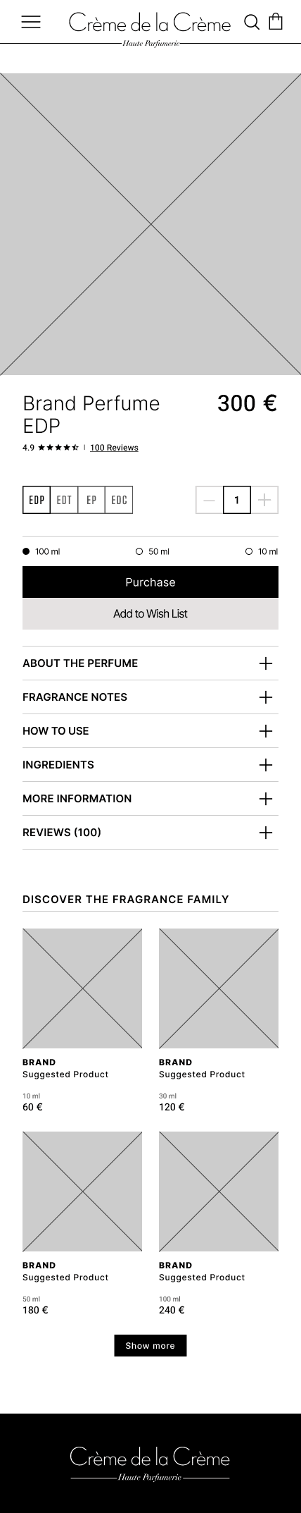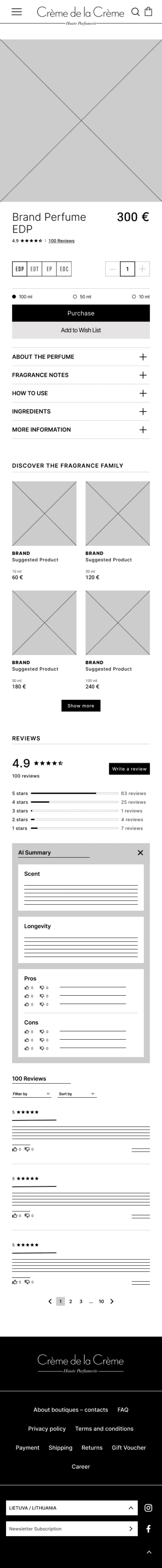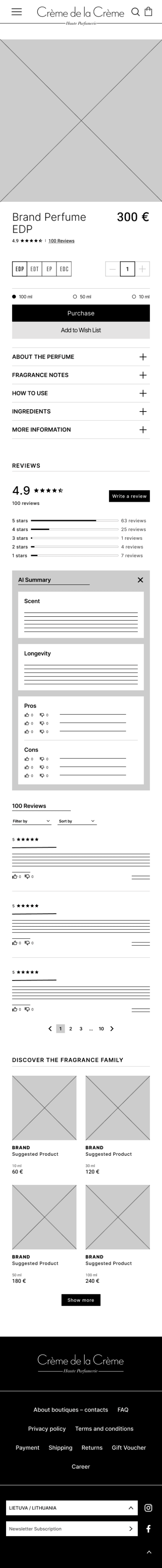 The only content Creme de la Creme displays on perfume pages is photos of the product, a description with an Accordion menu and suggested products in the so called Fragrance family. I needed to decide where to place the review section.