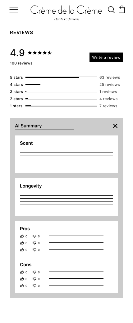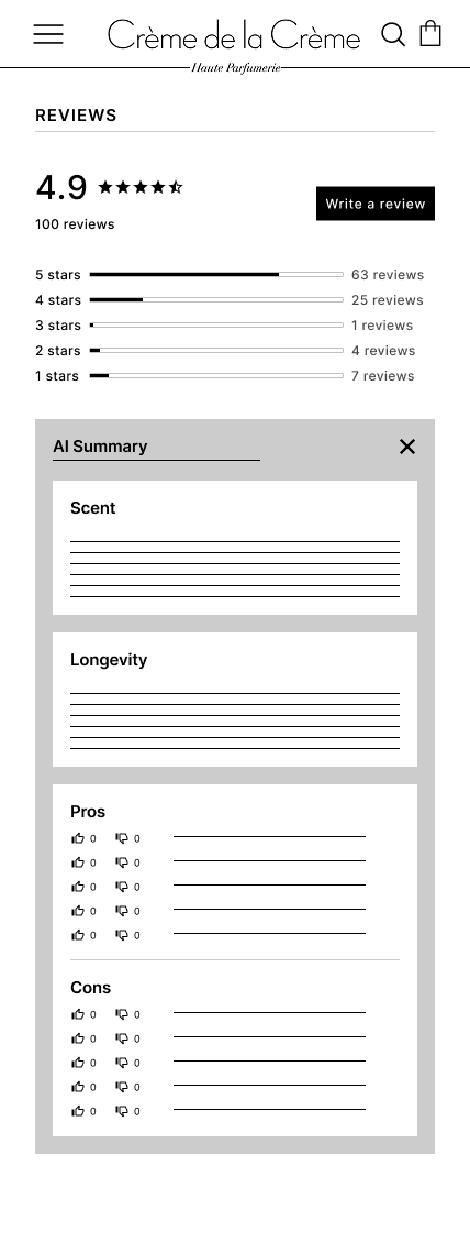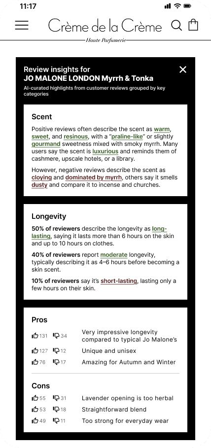 I envisioned the AI summary card as a “fragrance in a nutshell” section, which would provide the customers’ general consensus on a perfume while fitting perfectly on a mobile screen without needing to scroll.