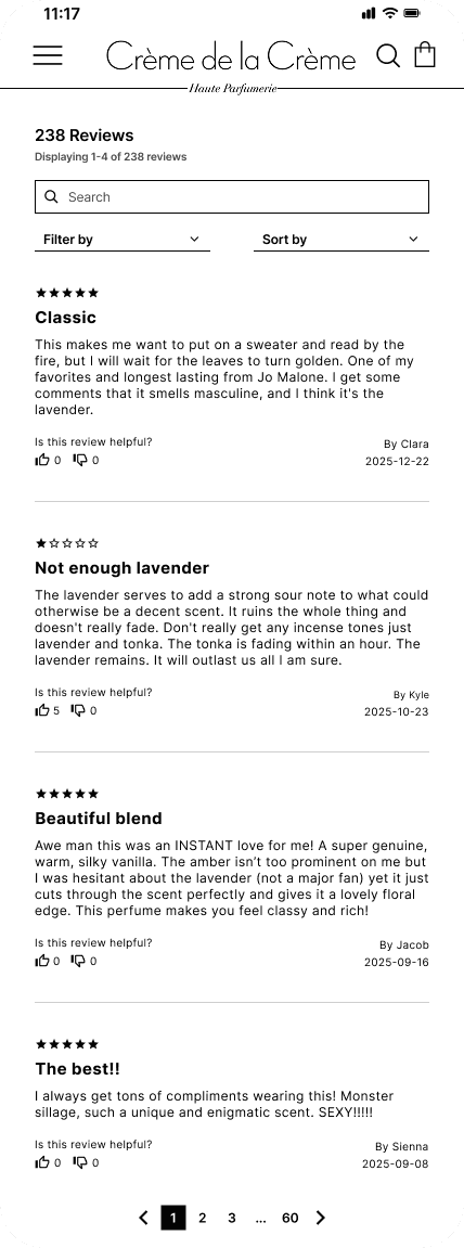 This project was personally very satisfying to design. I have been a customer of Creme de la Creme for a long time now and an even bigger fan of Fragrantica. The first thing I do after finding a nice smelling perfume is go to Fragrantica to look for notes and read through reviews. Which is why it was frustrating that Creme de la Creme didn’t have any.
