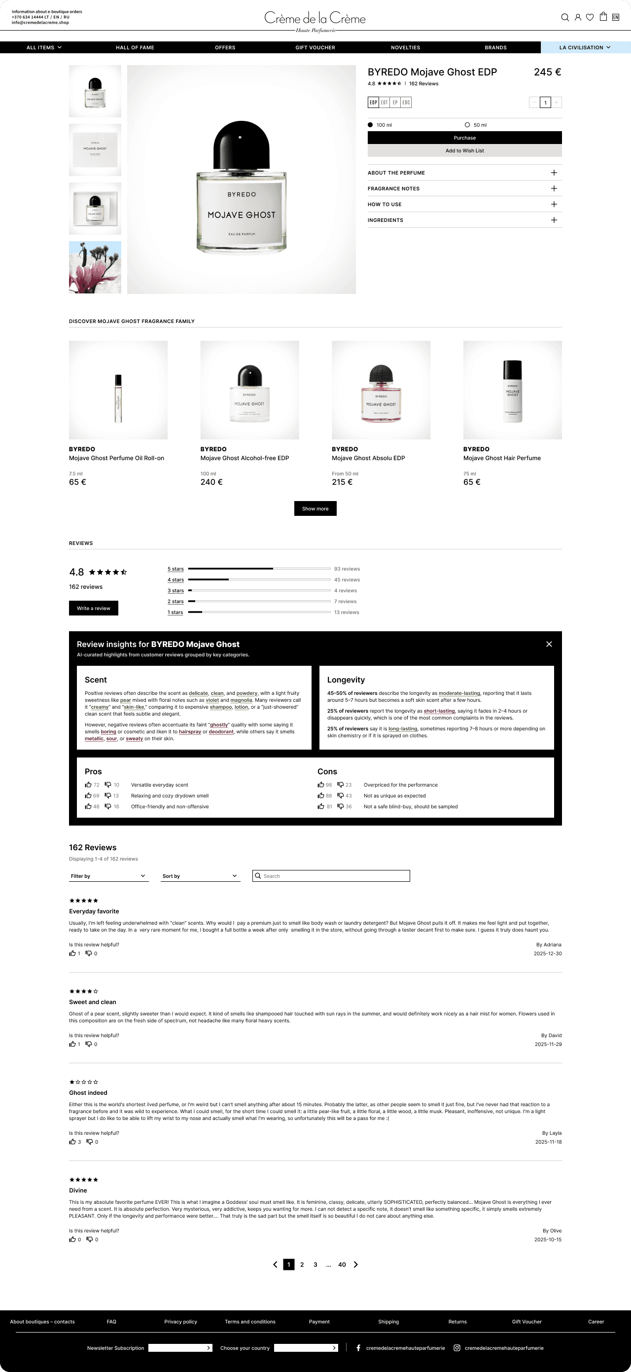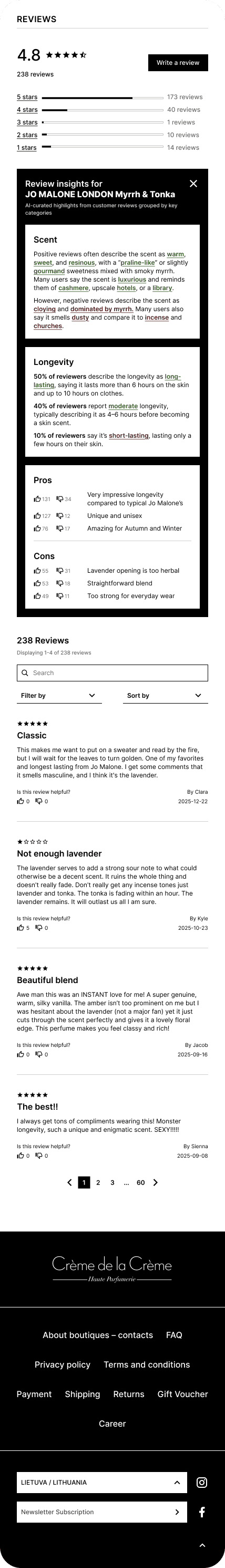 Lithuania’s largest luxury chain of perfume boutiques - Creme de la Creme - has a highly respectable reputation, a wide selection of world-class perfume houses and countless praising reviews about their customer service. But no reviews about their products anywhere on their website.