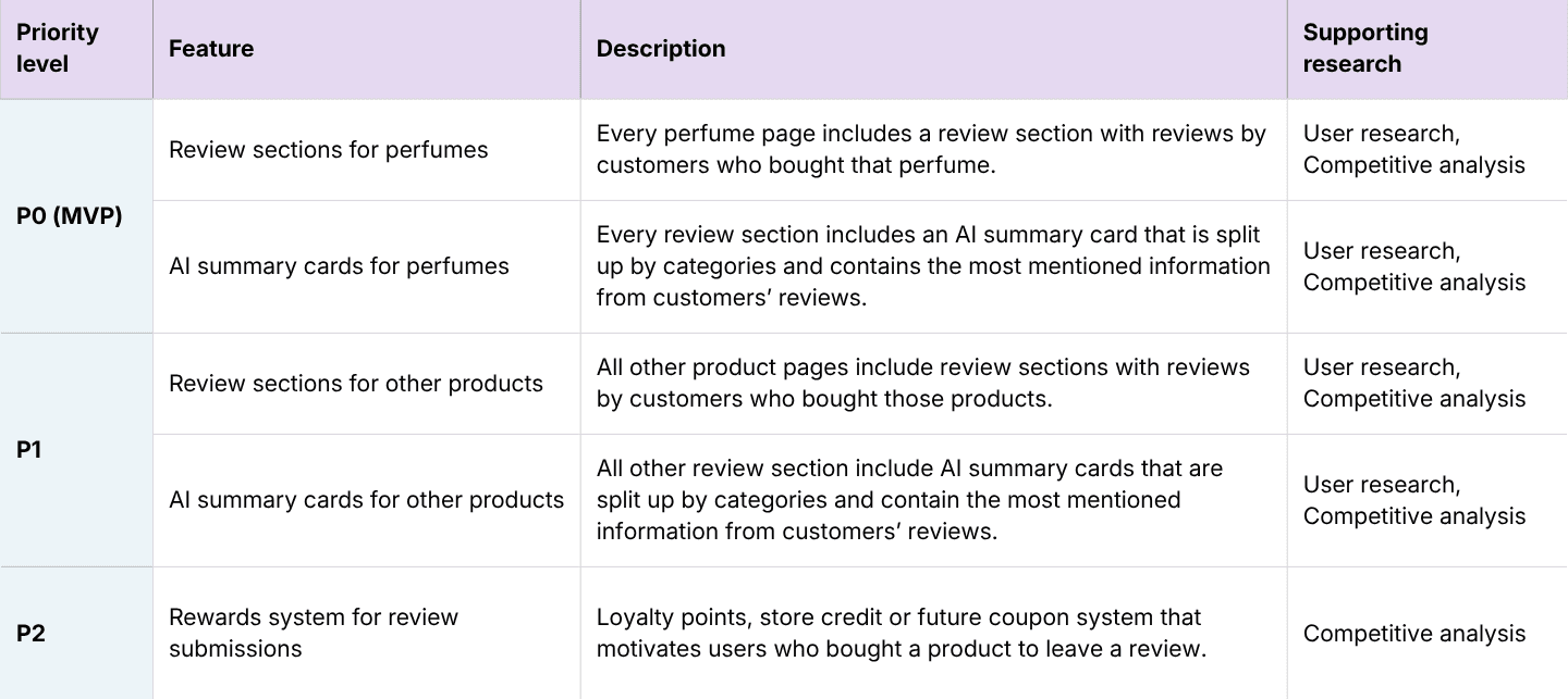Once I established the priorities, I turned insights into features and outlined the structure of the review section and the AI summary card within.