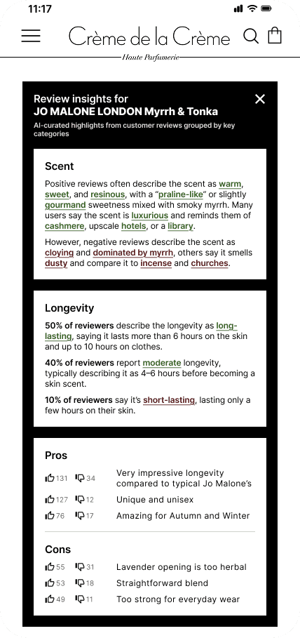 I envisioned the AI summary card having even more comprehensive filtering capabilities which would allow users to combine groups of filters - the afore mentioned ones with the ones from the Scent and Longevity categories to save users time by narrowing down reviews as precisely as possible.
