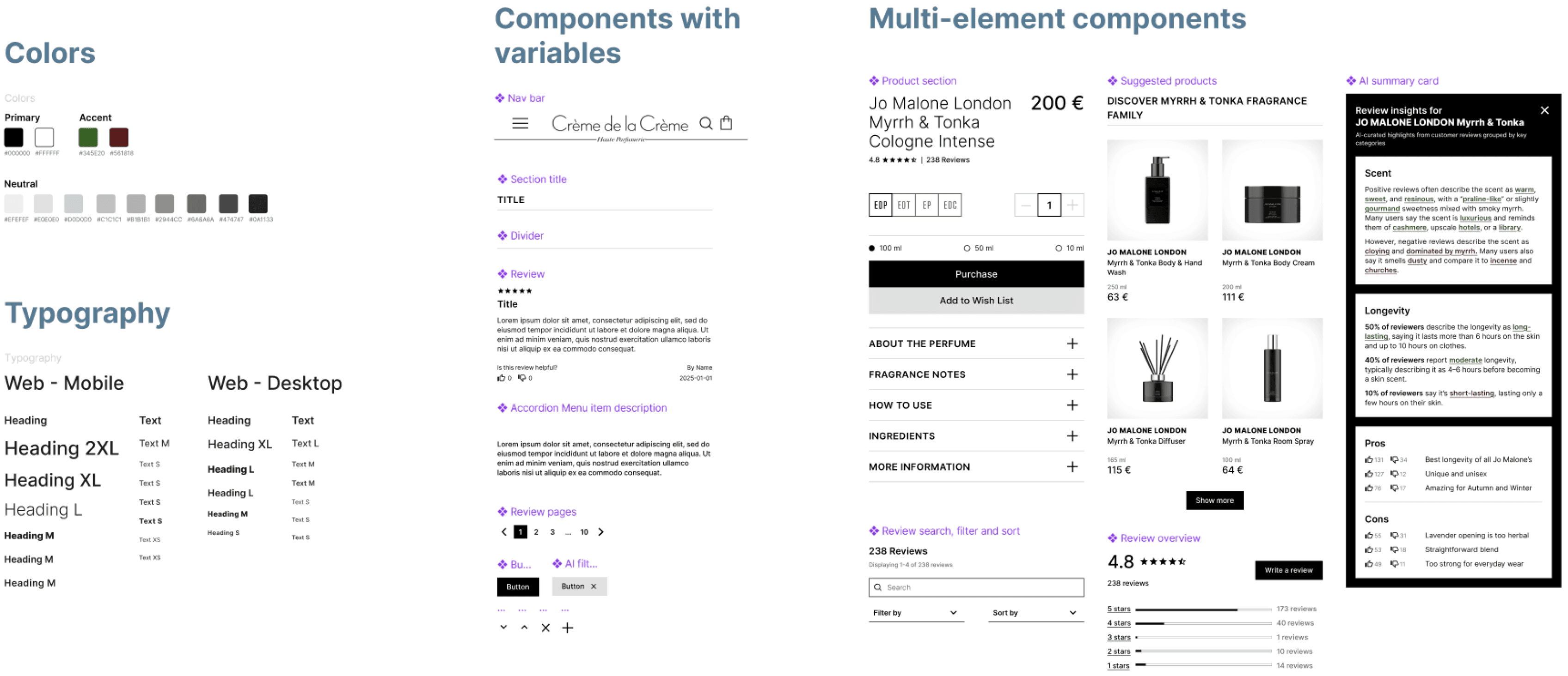 This projects scope contained only review sections and AI summary cards for perfumes. However, I strategized and designed with the anticipation that the feature roadmap would include all other product categories that Creme de la Creme has. So it was important to create a modular and scalable design system, whose components could be easily reused and edited across all designs.